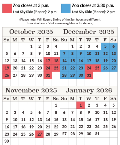 NOTE: Normal daytime Zoo hours are year-round, daily, 9 a.m. – 5 p.m., last timed entry at 3 p.m., unless otherwise noted. (Please note: Will Rogers Shrine of the Sun hours are different from Zoo hours and access to the Shrine varies.)