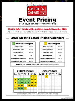 Items can be dropped off at Admissions between 9 a.m. – 3 p.m. any day of the week (by 2 p.m. on holidays), and between 4 – 7:30 p.m. on Electric Safari nights.